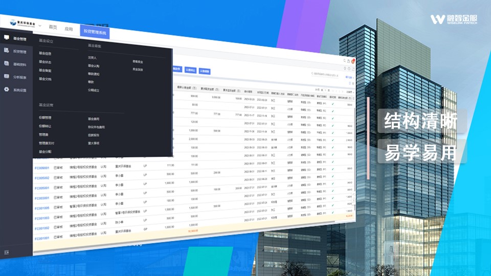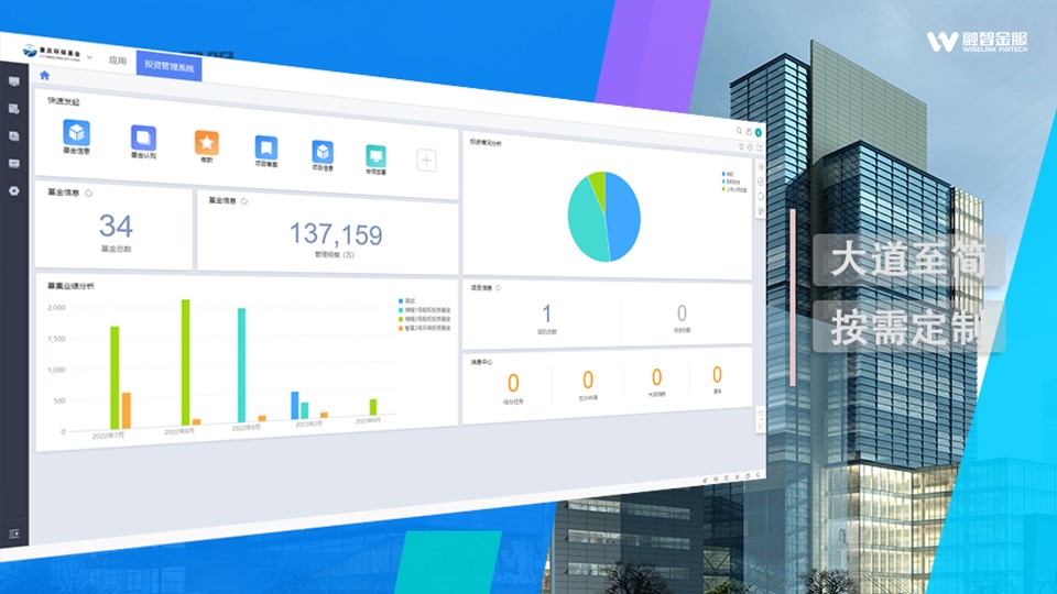 包括产品发行、预约打款、风险测评、佣金管理等模块,支持前台理顾与后台管理部门协同工作